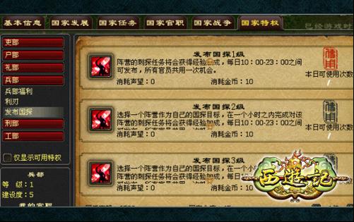 每天的10:00到23:00之间,天子、大唐太师、大唐太傅可在国家特权界面发布国探任务。选择一个阵营为国探目标,在任务发布期间完成目标阵营的刺探任务奖励将有额外加成。大量的“探子”潜入也给敌方边境带来严重威胁,一场“围、追、堵、截”的领土保卫战即将上演,而在此期间斩杀“探子”将会获得双倍荣誉。